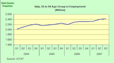 I have also found a limited breakdown for part time work by age. The two categories which the Italian statistics office use are "15 to 34" and "35 and over". Now strange as it may seem the number of part-time jobs for the 15 to 34 age group actually went DOWN between Q1 2004 and Q3 2007 - from 1.107 millions to 1.102 million - while among the over 35s it went up from 1.74 to 2.121 million. So Italy's new part-time workers are by-and-large not young, and it is a good bet that the majority of these new workers come from the over 55 group, and that it this kind of work which is responsible for the increase in the participation rates at the higher ages.