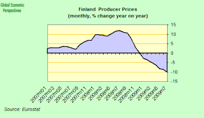The main reasons for the drop in producer prices was obviously the reduction in the price of oil products and metals, but again between July and August producer prices for manufactured products rose by 0.7 per cent. The rise in the prices came especially from increased prices of oil products, with the monthly rise in prices restrained somewhat by reductions in the price of paper and paper board. But all of this begs one important question - would price deflation in Finland be a good or a bad thing? Evidently Europe's monetary authorities are divided on just this question. For output to recover from the global financial shock mild inflation is certainly much better than mild deflation, but what about Finland's competitiveness issue? Finland needs some sort of price correction, to get back onto a positive export path, even if not of the order of the one which is needed in Spain and Ireland. This is the big disadvantage of sharing a common currency and not having one of your own to devalue. But clearly ongoing deflation will only weaken domestic consumption (as people put off purchase decisions into the future) and will compound any indebtedness problems there may be in the private sector.